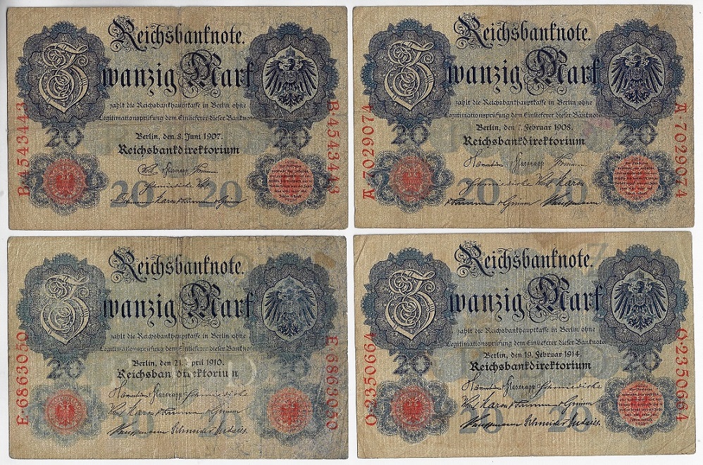 | 61103 | Alemanha, 20 Marcos, 1907, 1908, 1910 e 1914, Pick-28, 31, 40b e 46b, BC/MBC (catálogo US$ 29,62) | 119,00 | Foto |