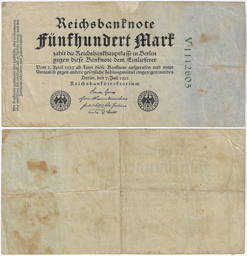 | 61105 | Alemanha, 500 Marcos, 1922, Pick-74b, unifacial, MBC- com pequeno raspado frontal | 20,00 | Foto |