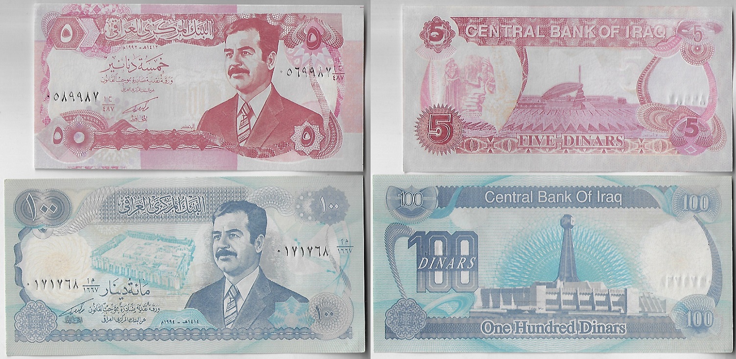 | 63411 | Iraque, 5 e 100 Dinares, 1992/1994, Pick-80 e 84, Saddam Hussein, ambas FE (catálogo US$5) | 16,00 | Foto |