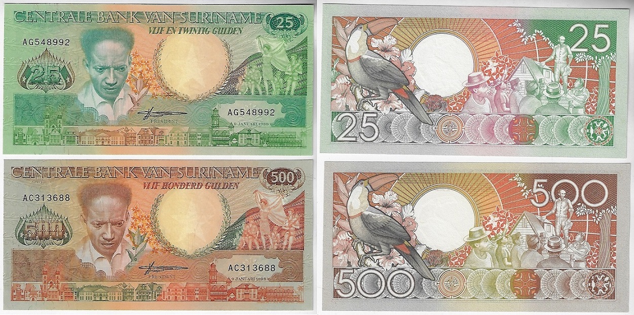| 66608 | Suriname, 25 e 500 Gulden, 1988, Pick-132b e 135b, ambas FE (catálogo US$16) | 64,00 | Foto |