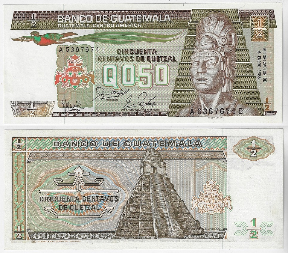 | 74283 | Guatemala, ½ Quetzales, 1988, Pick-65, FE (catálogo US$14) | 56,00 | Foto |