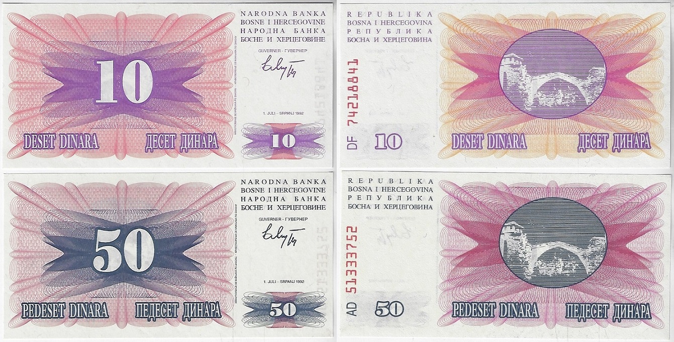 | 77206 | Bósnia-Herzegovina, 10 e 50 Dinara, 1992, Pick-10 e 12, ambas FE | 14,00 | Foto |