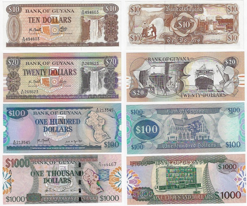 | 77380 | Guiana, 10, 20, 100 e 1.000 Dólares, Pick-23f, 27, 28 e 35, 1989/2000, todas FE (catálogo US$24,5) | 98,00 | Foto |