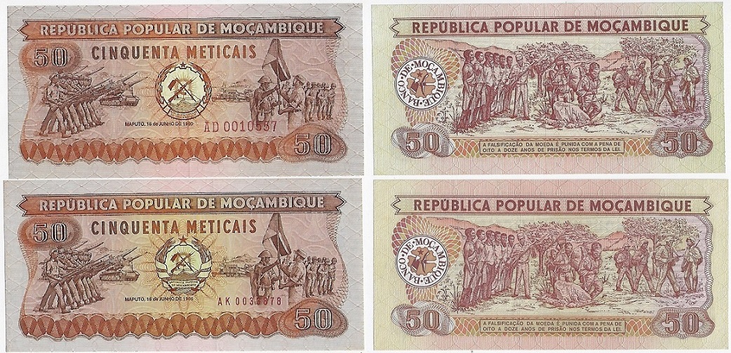| 77387 | Moçambique, 50 Meticais, 1980 e 1986, Pick-125 e Pick-129b, FE | 11,00 | Foto |
