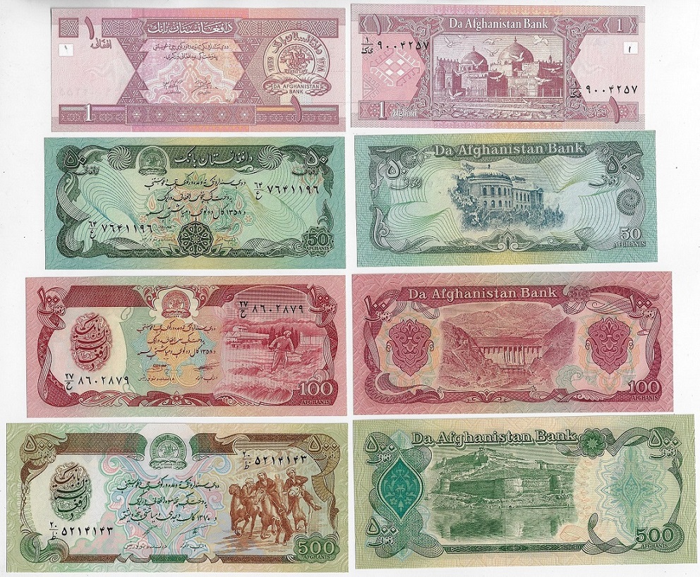 | 78633 | Afeganistão, 1, 50, 100 e 500 Afeganes, Pick-57a, 58a, 60c e 64a, total de 4 cédulas entre 1979/2002, todas FE (catálogo US$4,5) | 20,00 | Foto |