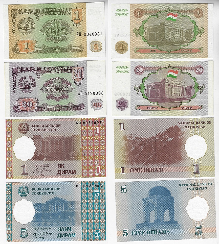 | 78639 | Tajiquistão, 1 e 20 Rublos, 1 e 5 Diram, Pick-1, 4, 10 e 11, 1994/1999, todas FE (catálogo US$8) | 32,00 | Foto |