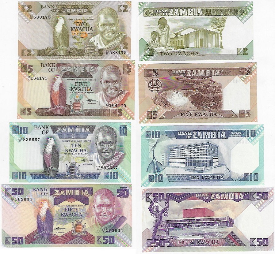 | 78640 | Zâmbia, 2, 5, 10 e 50 Kwachas, Pick-24c, 25d, 26e e 28, Águia, todas FE (catálogo US$26) | 104,00 | Foto |