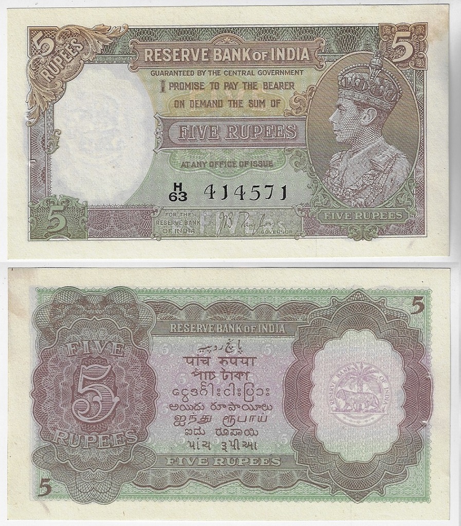 | 78682 | Índia Britânica, 5 Rúpias, 1937, Pick-18a, Rei George VI, assinatura J. B. Taylor, FE com leve amarelamento (catálogo US$250) | 1000,00 | Foto |