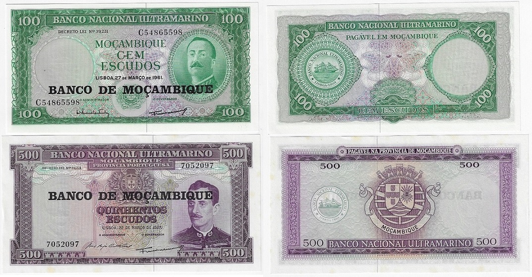 | 78686 | Moçambique, 100 e 500 Escudos, 1976, Pick-117/118, FE com leves pontos amarelados (catálogo US$8) | 32,00 | Foto |