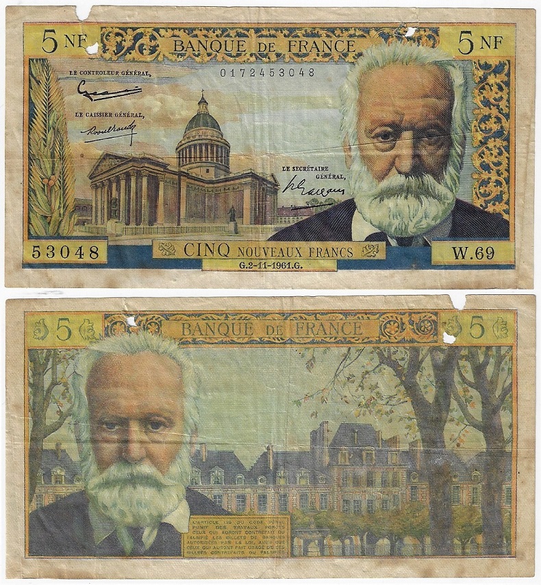 | 78841 | França, 5 Novos Francos, 1961, Pick-141, Victor Hugo, BC com vários furos de grampeador e outros maiores | 78,00 | Foto |