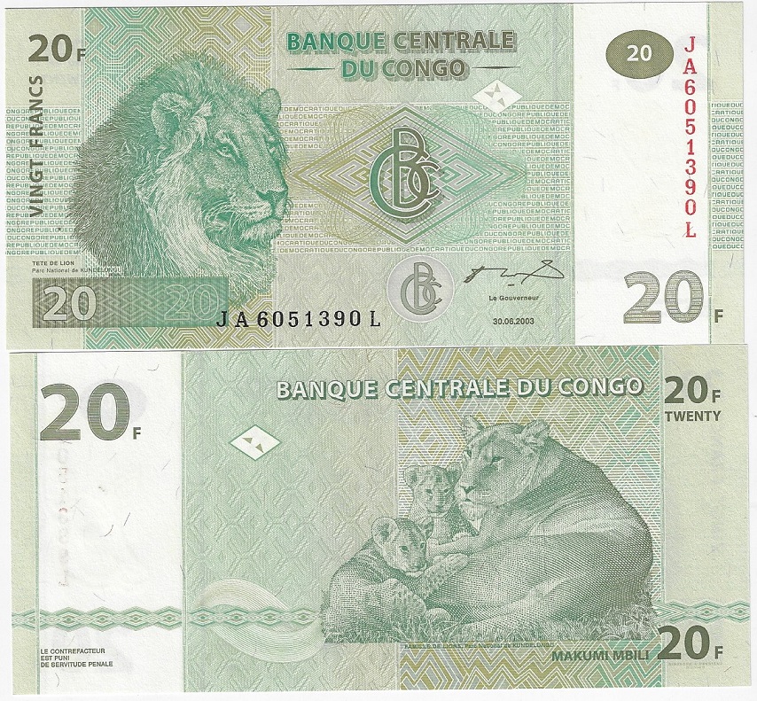 | 79334 | Congo, 20 Francos, 2003, Pick-94, Leão, FE (catálogo US$5) | 20,00 | Foto |