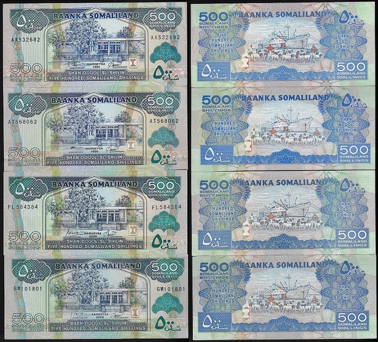 | 79387 | Somaliland, 500 Shillings, 1994, 1996, 2006 e 2008, Pick-6a, 6b, 6f e 6g, 4 cédulas FE (catálogo US$45) | 67,00 | Foto |