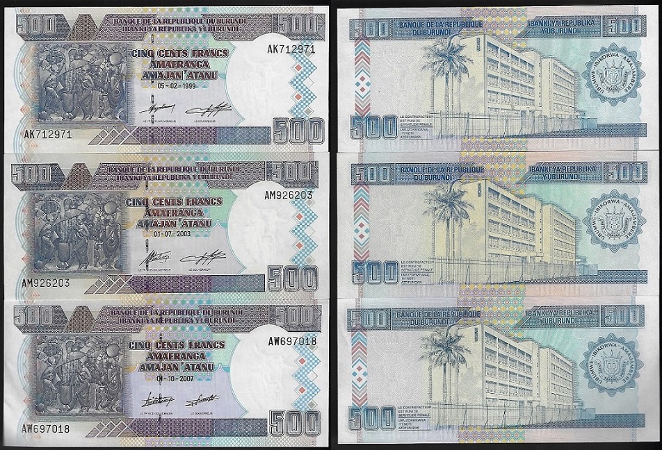 | 79390 | Burundi, 500 Francos, 1999, 2003 e 2007, Pick-38b, 38c e 38d, todas FE (catálogo US$19,5) | 78,00 | Foto |