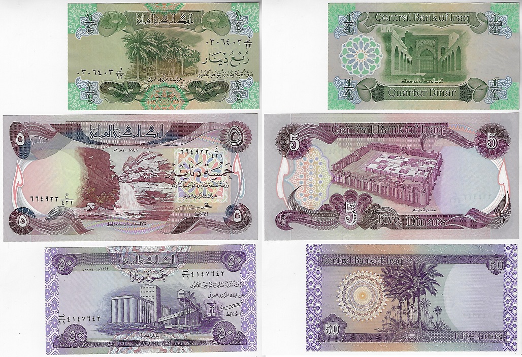 | 79415 | Iraque, ¼, 5 e 50 Dinares, 1979/2003, Pick-67, 70 e 90, todas FE (catálogo US$6,50) | 26,00 | Foto |