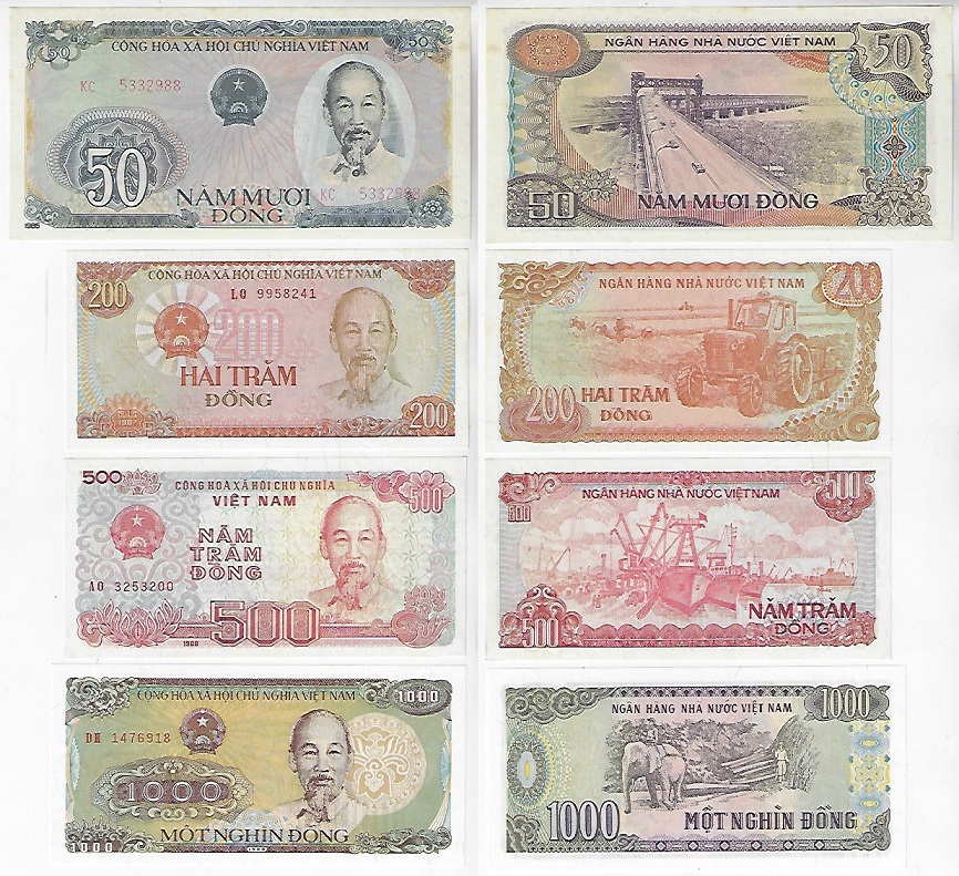 | 79477 | Vietnã, 50, 200, 500 e 1.000 Dong, 1985/1988, Pick-97, 100, 101a e 106a, Ho Chi Minh, todas FE (catálogo US$ 7,50) | 30,00 | Foto |