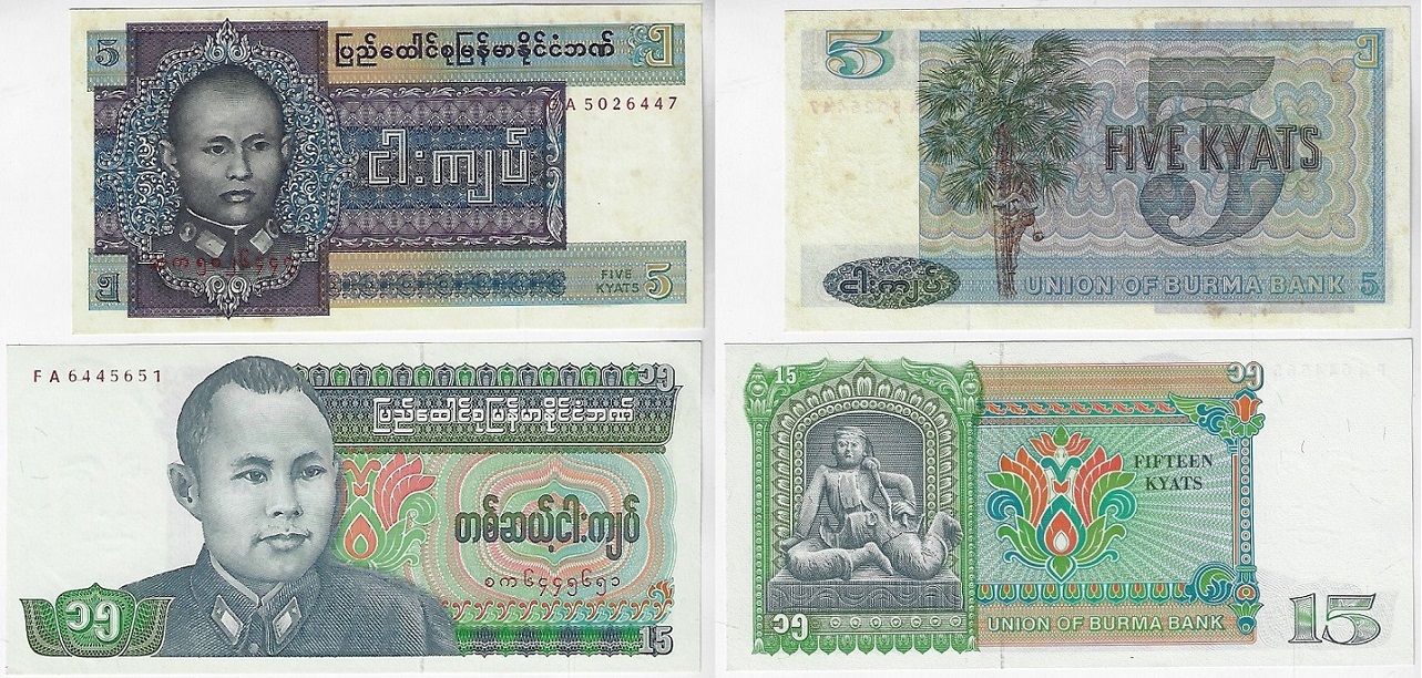 | 79489 | Burma, 5 e 15 Kyats, 1973/1986, Pick-57 e 62, General Aung San, ambas FE | 12,00 | Foto |