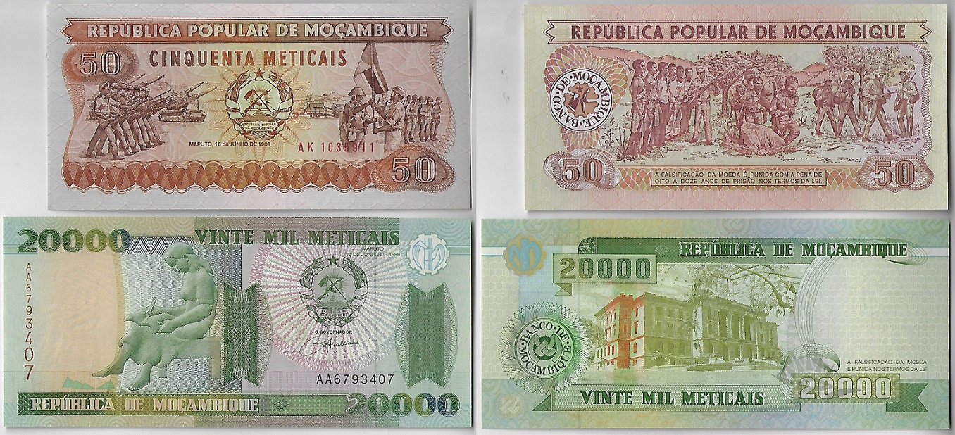 | 81074 | Moçambique, 50 e 20.000 Meticais, 1986/1999, Pick-129b e 140, ambas FE (catálogo US$5) | 20,00 | Foto |