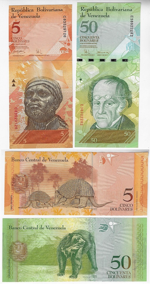 | 81876 | Venezuela, 5 e 50 Bolívares, 2007 e 2008, Pick-89a e 92, Tatu e Urso, ambas FE | 20,00 | Foto |