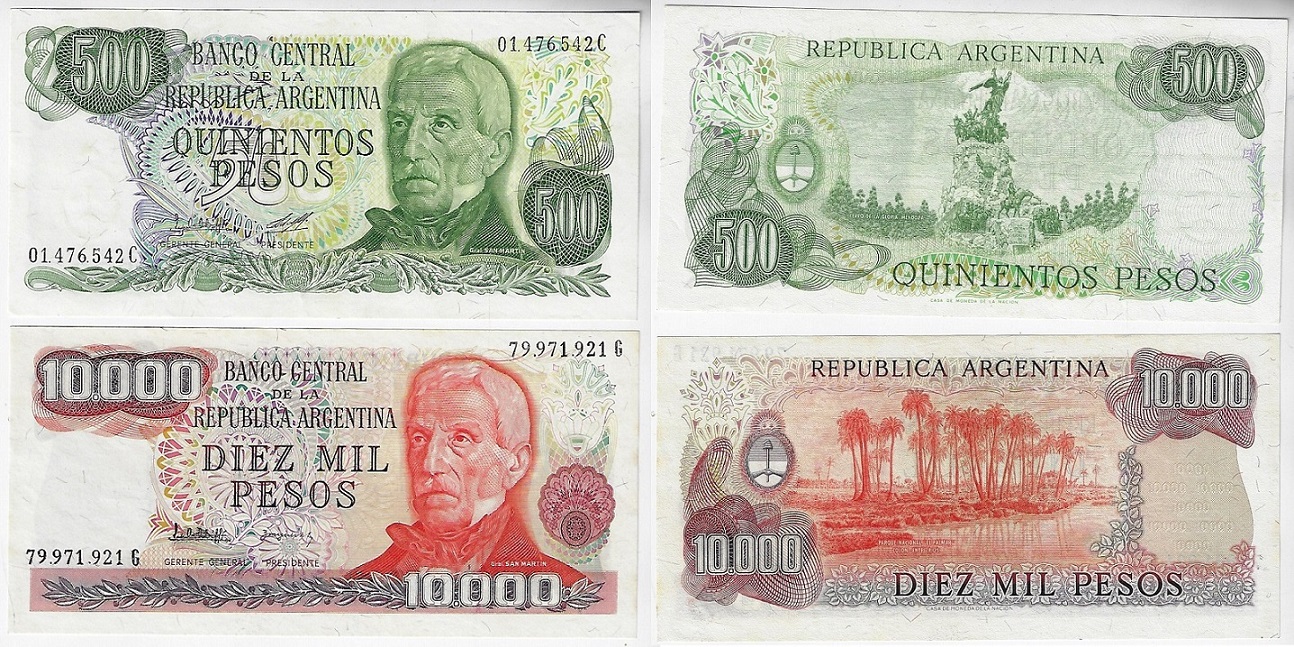 | 81890 | Argentina, 500 e 10.000 Pesos, 1976/1983, Pick-303b e 306a, ambas FE (catálogo US$5,5) | 22,00 | Foto |