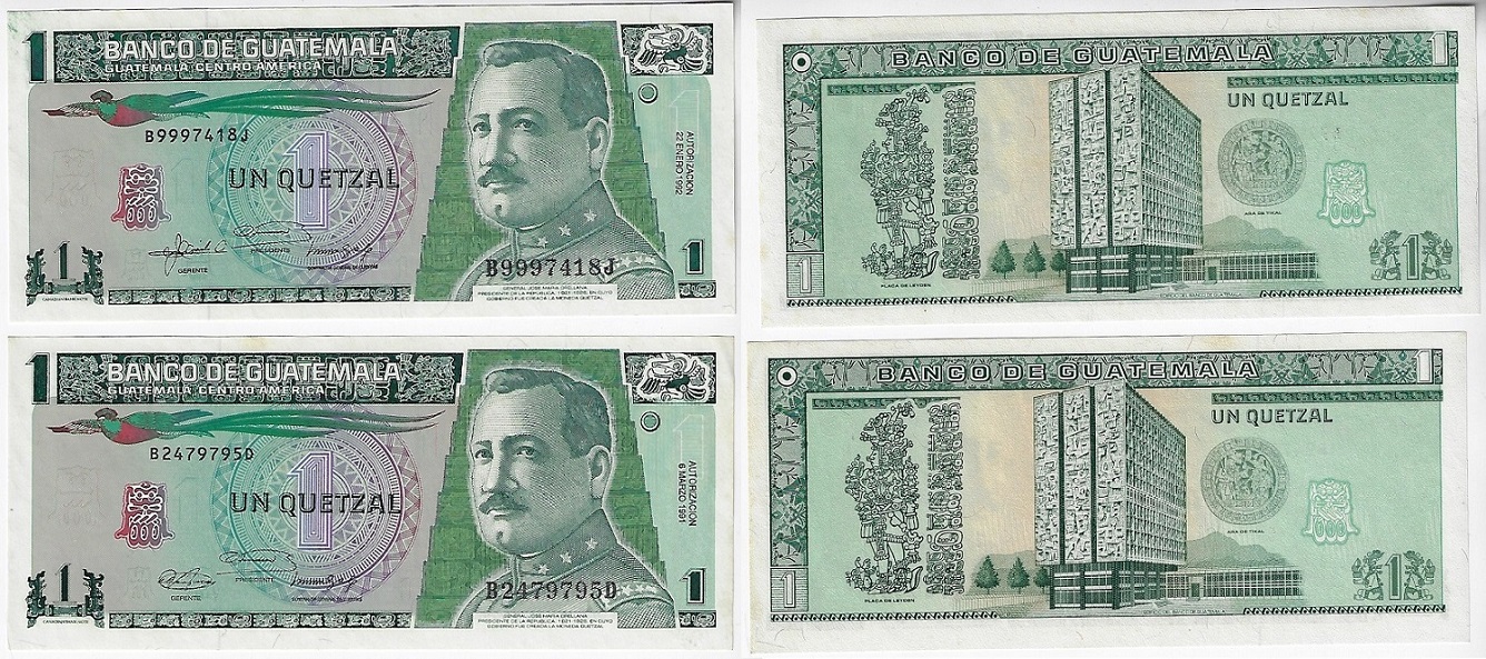 | 81948 | Guatemala, 1 Quetzal, 1991/1992, Pick-73b e 73c, FE com leves pontos amarelados (catálogo US$12) | 48,00 | Foto |