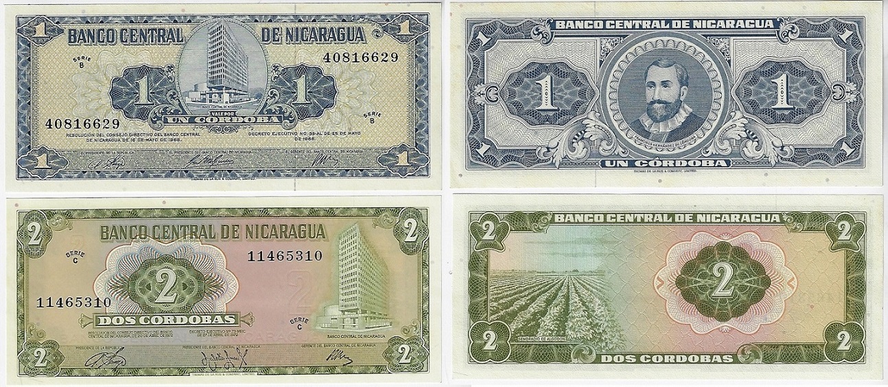 | 81985 | Nicarágua, 1 e 2 Córdobas, 1968 e 1972, Pick-115 e 121a, ambas FE (catálogo US$12) | 48,00 | Foto |