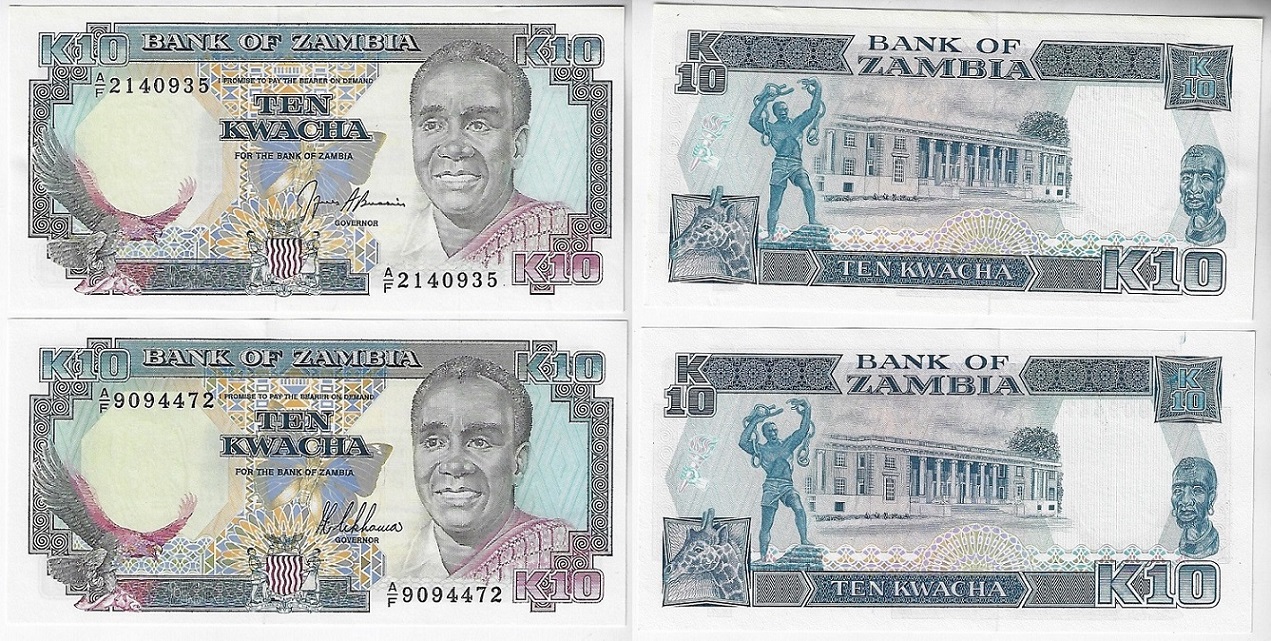 | 82243 | Zâmbia, 10 Kwacha, 1989/1991, Pick-31a e 31b, ambas FE (catálogo US$12,5) | 32,00 | Foto |