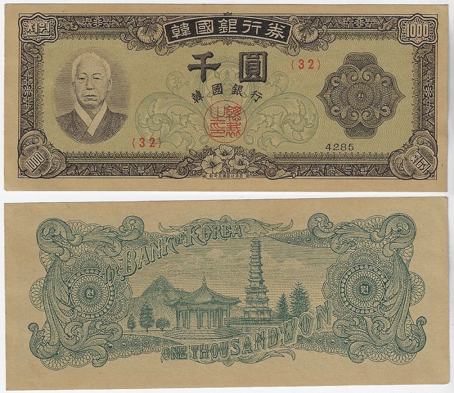 | 82270 | Coréia do Sul, 1.000 Won, 1952, Pick-10a, FE (catálogo US$250) | 1000,00 | Foto |