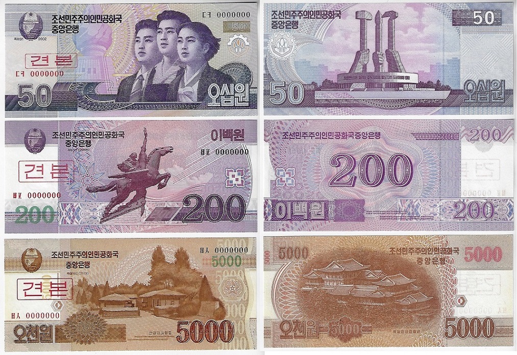 | 82336 | Coréia do Norte, 50, 200 e 5.000 Won, 2002/2013, Specimen, numeração zerada, todas FE | 57,00 | Foto |