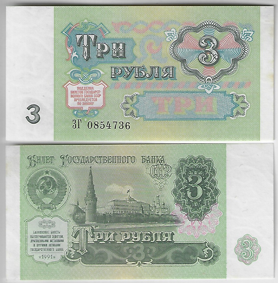 | 82351 | Rússia, 3 Rublos, 1991, Pick-238, Kremlin, FE com leves pontos amarelados (catálogo US$3) | 12,00 | Foto |