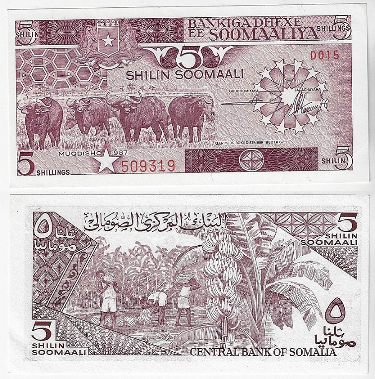 | 82367 | Somália, 5 Shilin ou 5 Shillings, 1987, Pick-31c, Búfalos e Bananas, FE | 20,00 | Foto |