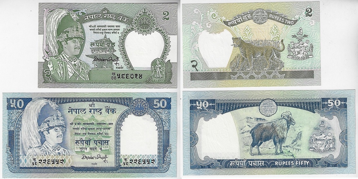 | 82611 | Nepal, 2 e 50 Rúpias, 1981/1983, Pick-29c e 33b, Leopardo e Tahr, ambas FE (catálogo US$6) | 24,00 | Foto |