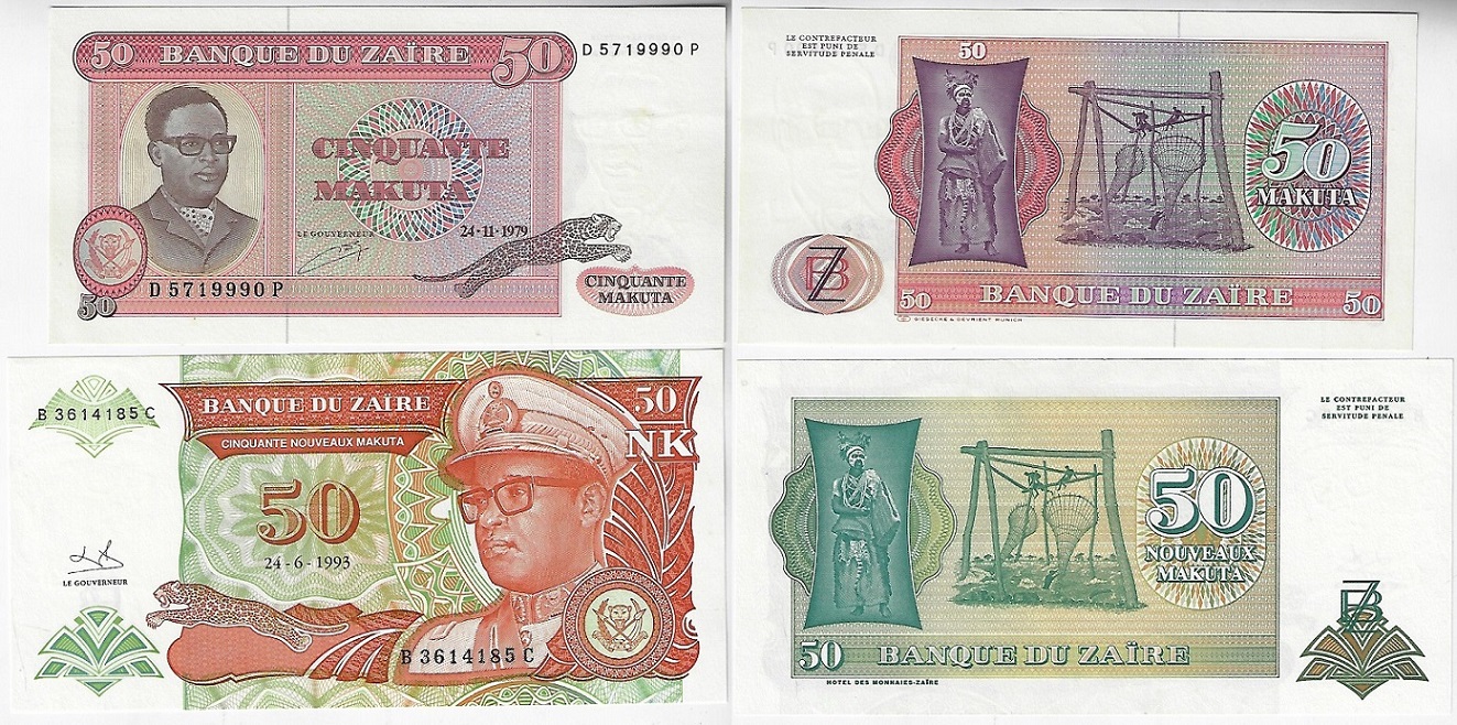 | 82740 | Zaire, 50 Makuta, 1979, Pick-17a e 50 Novos Makuta, Pick-51, 1993, ambas FE (catálogo US$8,25) | 40,00 | Foto |