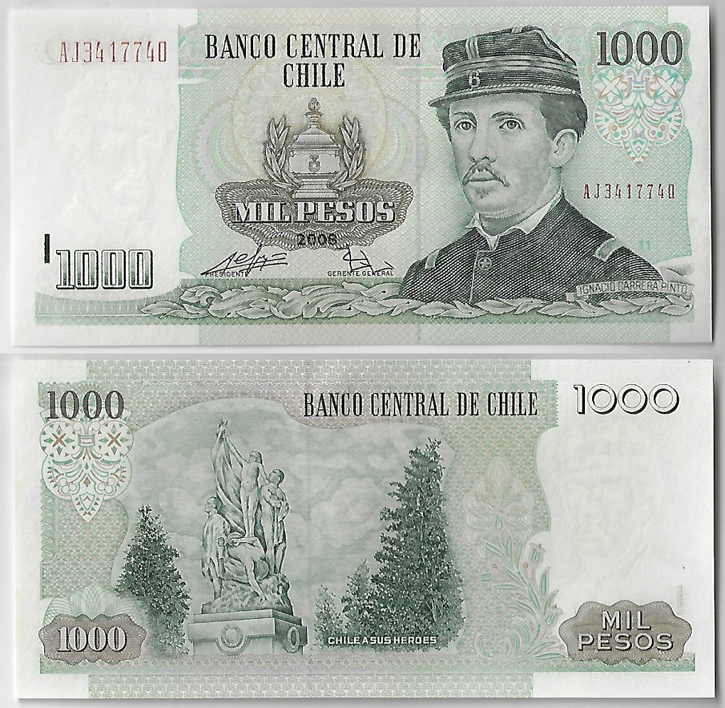 | 82773 | Chile, 1.000 Pesos, 2008, Capitão Ignacio Carrera Pinto, Pick-154g, FE (catálogo US$5) | 20,00 | Foto |