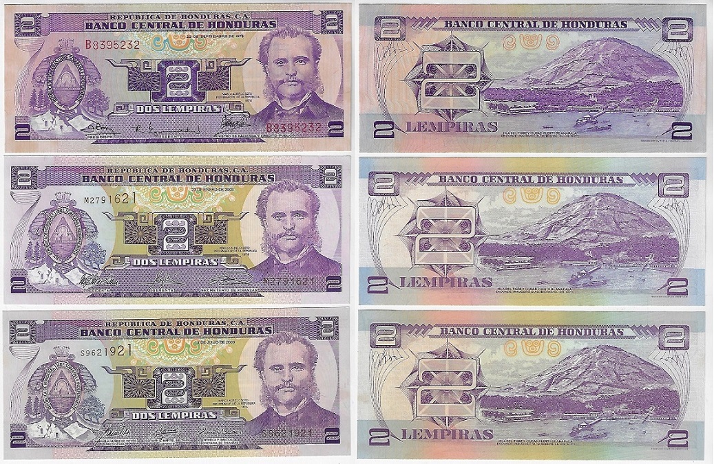 | 82788 | Honduras, 2 Lempiras, 1976, 2003 e 2006, Pick-61, 80Ad e 80Ae, todas FE (catálogo US$12) | 48,00 | Foto |