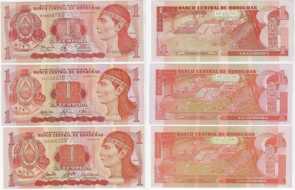 | 82931 | Honduras, 1 Lempira, 1994, 2003 e 2006, Pick-76, 84c e 84e, todas FE (catálogo US$3,5) | 14,00 | Foto |