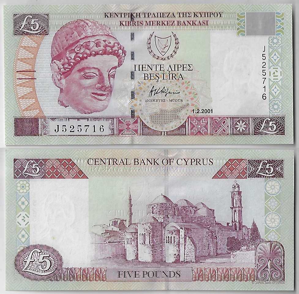 | 83040 | Chipre, 5 Libras, 2001, Pick-61a, Igreja de Peristerona e Mesquita turca, FE (catálogo US$70) | 280,00 | Foto |