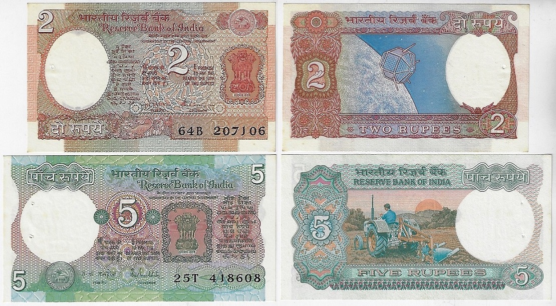 | 83088 | Índia, 2 e 5 Rúpias, 1975/1973, Pick-79l e 80p, ambas FE com furo de grampeador junto a borda esquerda (o que é padrão desta emissão) (catálogo US$7) | 28,00 | Foto |