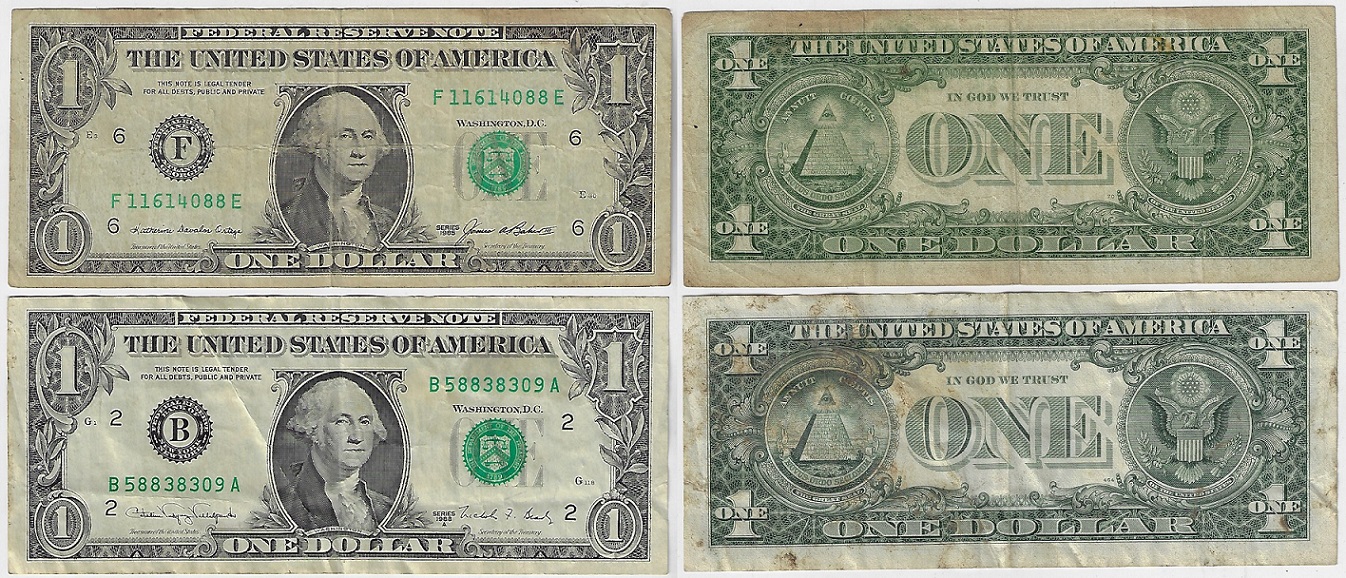 | 83110 | EUA, 2 cédulas de 1 Dólar, anos 1985 (Pick-474) e 1988A (Pick-480b), ambas MBC | 15,00 | Foto |