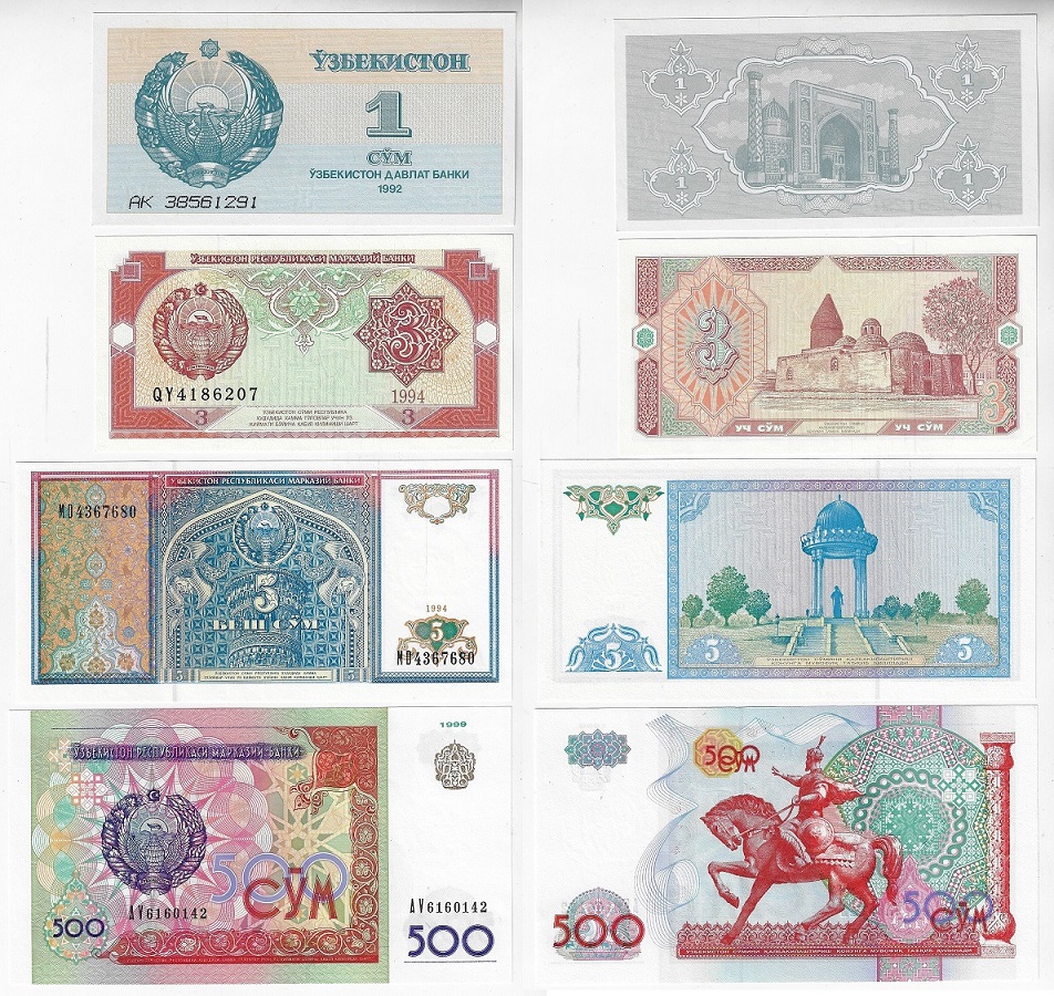 | 83139 | Uzbequistão, 1, 3, 5 e 500 Sum, 1992/1999, Pick-61, 74, 75 e 81, todas FE (catálogo US$16) | 37,00 | Foto |