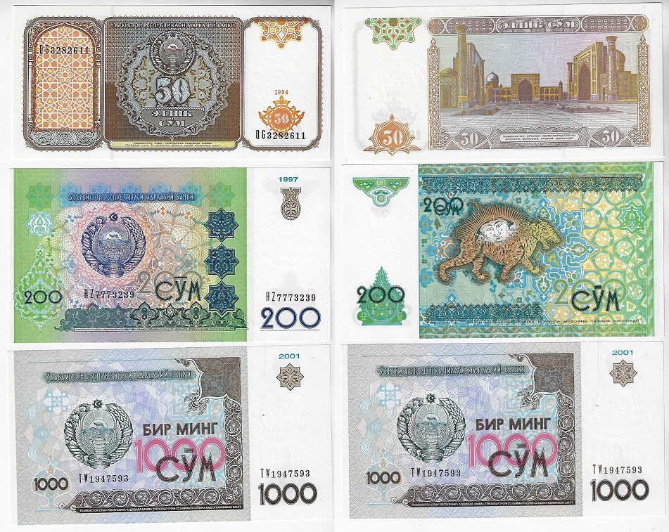 | 83140 | Uzbequistão, 50, 200 e 1.000 Sum, 1994/2001, Pick-78, 80 e 82, todas FE (catálogo US$20) | 32,00 | Foto |