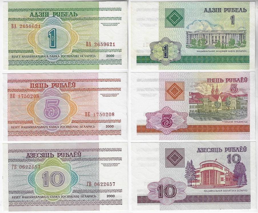 | 83145 | Bielorrússia, 1, 5 e 10 Rublos, 2000, Pick-21/23, todas FE (catálogo US$3) | 12,00 | Foto |