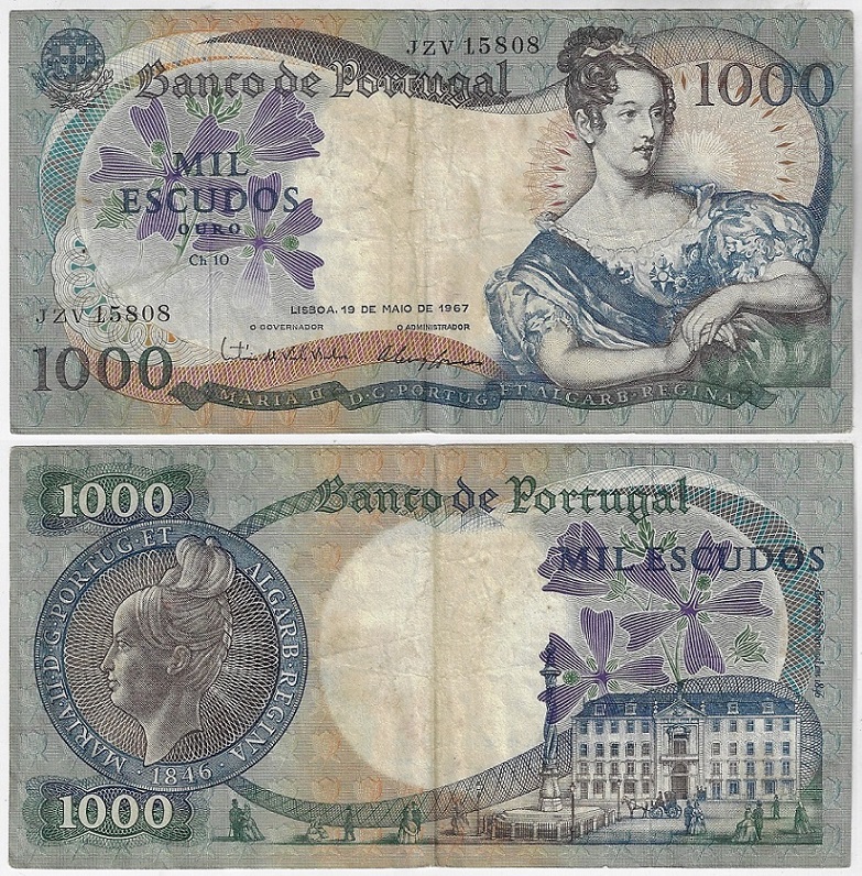 | 83834 | Portugal, 1.000 Escudos, 1967, Pick-172a, Rainha Maria II, MBC (catálogo US$50) | 200,00 | Foto |
