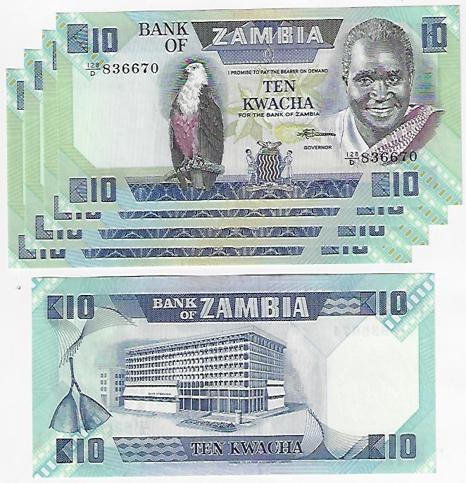 | 44788 | Zâmbia, 10 Kwacha, 1986/1988, Pick-26e, 5 cédulas, FE | 47,00 | Foto |