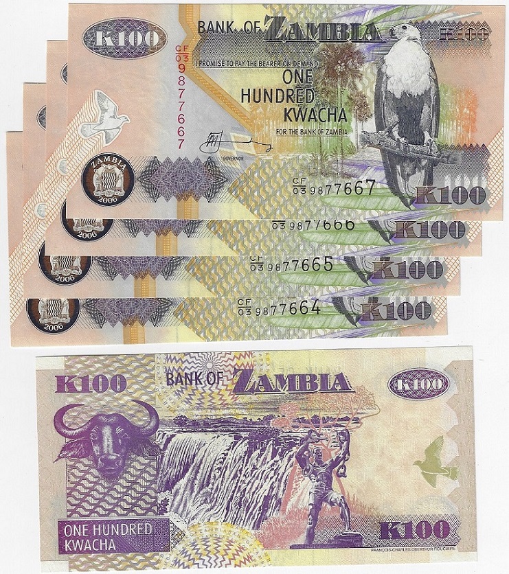 | 52487 | Zâmbia, 100 Kwacha, 2006, Pick-38F, 5 cédulas, FE | 21,00 | Foto |