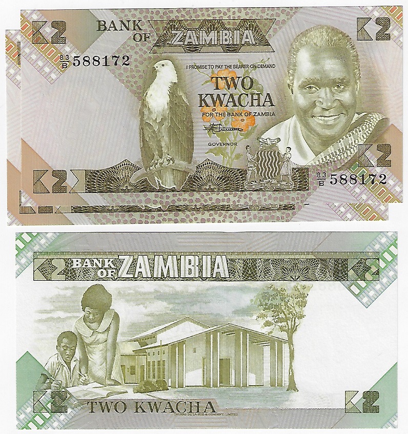 | 54108 | Zâmbia, 2 Kwacha, 1980/1988, Pick-24c, 3 cédulas, FE (catálogo US$21) | 34,00 | Foto |
