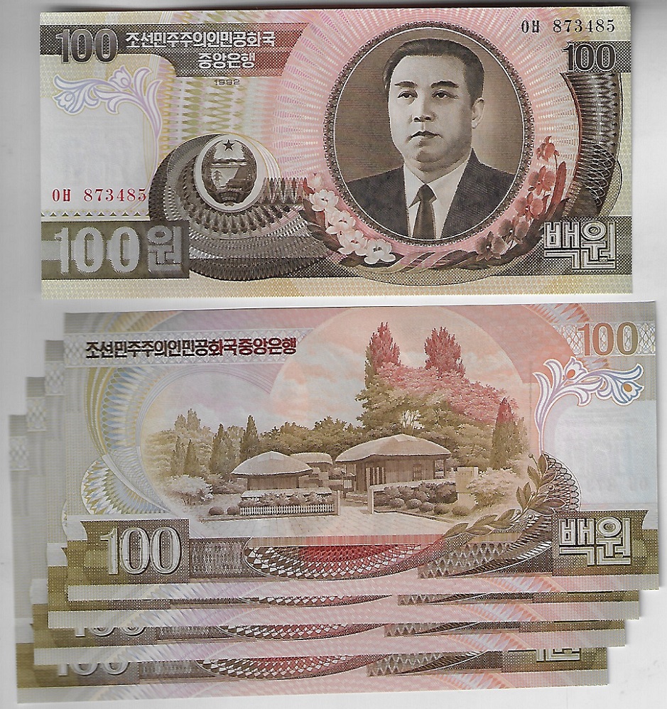 | 57238 | Coréia do Norte, 100 Won, 1992, Pick-43, 5 cédulas com numeração sequencial, FE (catálogo US$37,5) | 30,00 | Foto |
