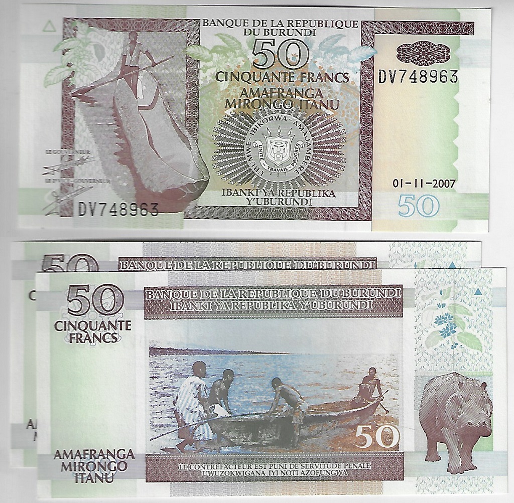 | 75974 | Burundi, 50 Francos, 2007, Pick-36, 3 cédulas com numeração sequencial, Barco e Hipopótamo, FE (catálogo US$6) | 12,00 | Foto |