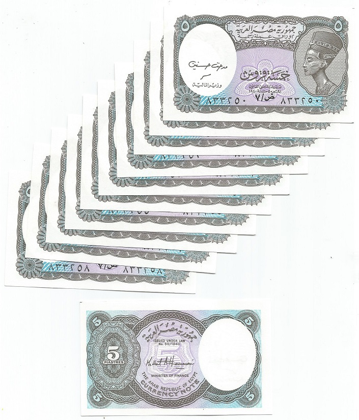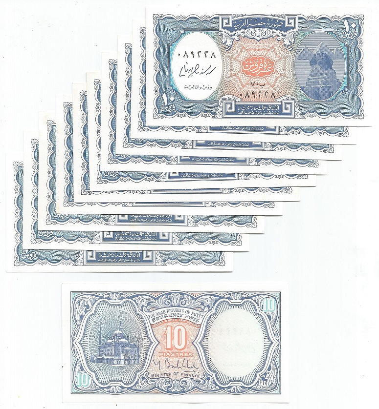 | 75983 | Egito, 10 Piastras, cores azul e laranja, 10 cédulas, Esfinge e Pirâmides, FE com leves pontos de ferrugem | 20,00 | Foto |