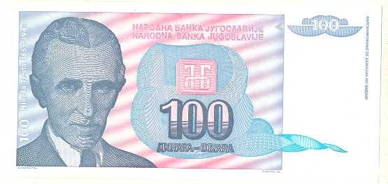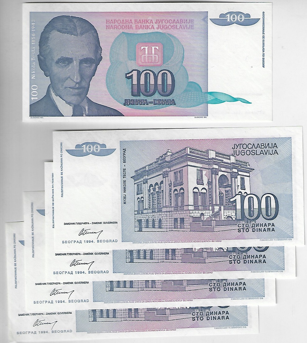 | 76286 | Iugoslávia, 100 Dinares, 1994, Pick-139, Tesla, 5 cédulas, FE (catálogo US$5) | 15,00 | Foto |