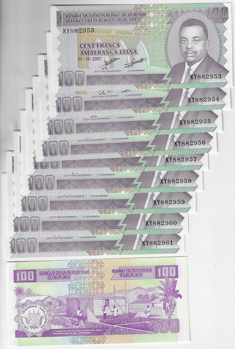 | 79397 | Burundi, 100 Francos, 2007, Pick-37f, 10 cédulas com numeração sequencial, FE (catálogo US$30) | 48,00 | Foto |